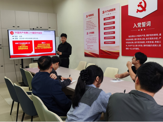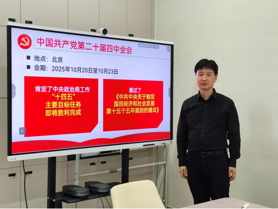 10月28日上午,张俊副院长在机械楼南413会议室以《学习党的二十届四中全会精神聚焦“十五五”经济社会新发展》为题,为机械设计系党支部党员上专题党课。会议由机械设计系党支部副书记吁鹏飞主持。