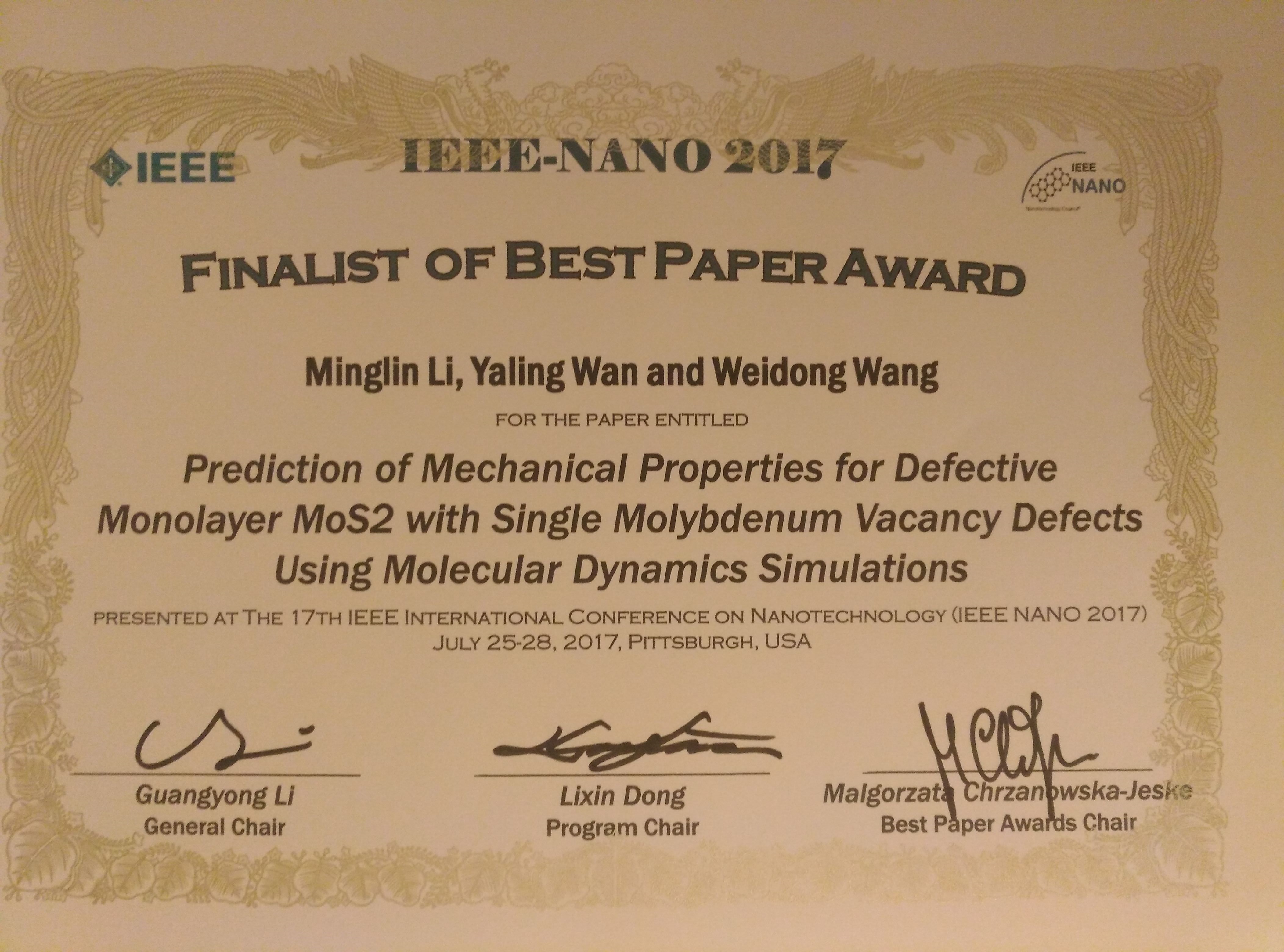 李明林副教授小组论文“Prediction of Mechanical Properties for Defective Monolayer MoS2 with Single Molybdenum Vacancy defects Using Molecular Dynamics Simulations”获得本届大会最佳论文提名奖(Final Paper List)的殊荣,这是大象传媒