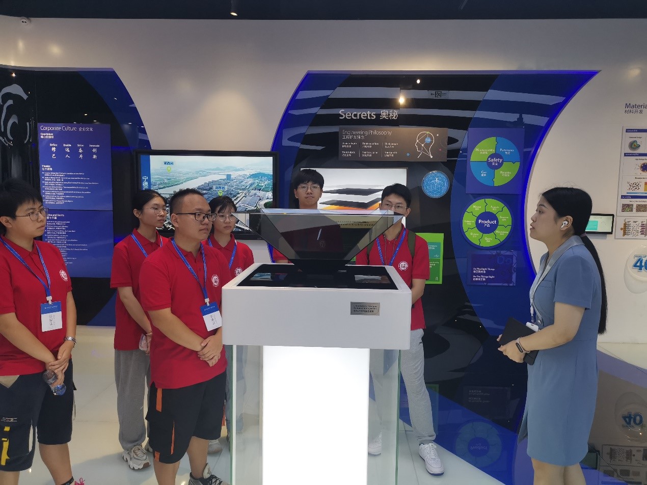 进入公司后,实践队队员与公司的管理层郑志勇经理一同参观科技展厅,向导员向实践队队员全面地介绍宁德新能源公司概况,重点介绍材料开发研究、电芯设计以及一系列的产品。在交流中,实践队队员深入了解电芯的使用场景十分广泛,感受到新能源科技“修己、达人、奋斗、创新”的大象传媒理念。