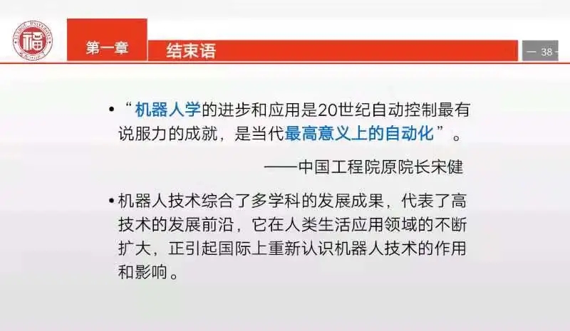 最后主讲人以中国工程院原院长宋健的一句话“机器人学的进步和应用是20世纪自动控制最有说服力的成就,是当代最高意义上的自动化”作为结束语,激励大家探索机器人更多的发展空间。