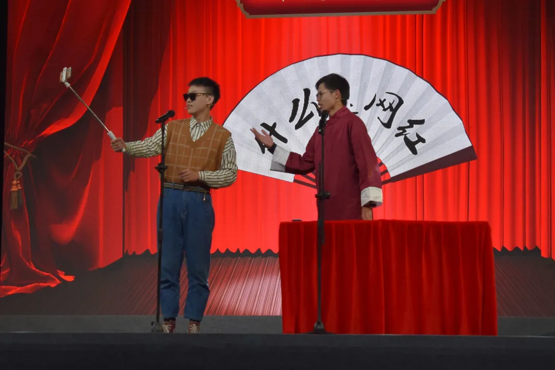 的同学一捧一逗,用幽默诙谐的语言、生动的神态和入戏的动作讽刺了如今哗众取宠的网红热潮,使得台下同学不时随着包袱捧腹大笑、拍手叫好。