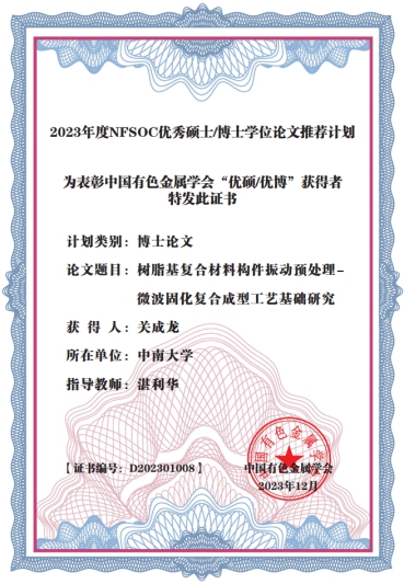据悉,中国有色金属学会是中国科协所属的全国性国家一级学会。该学会自2020年起,开始评选“优秀博士/硕士学位论文奖”,每年一次,旨在推动中国有色金属领域的科技进步,鼓励创新性研究,激励有色金属领域的硕士/博士研究生潜心钻研,务实创新,表彰做出优秀成果的年轻学者。经个人申报、单位推荐、通讯评审和答辩会评,学会本年度在全国范围内共评出13篇优秀博士论文,8篇优秀硕士论文。