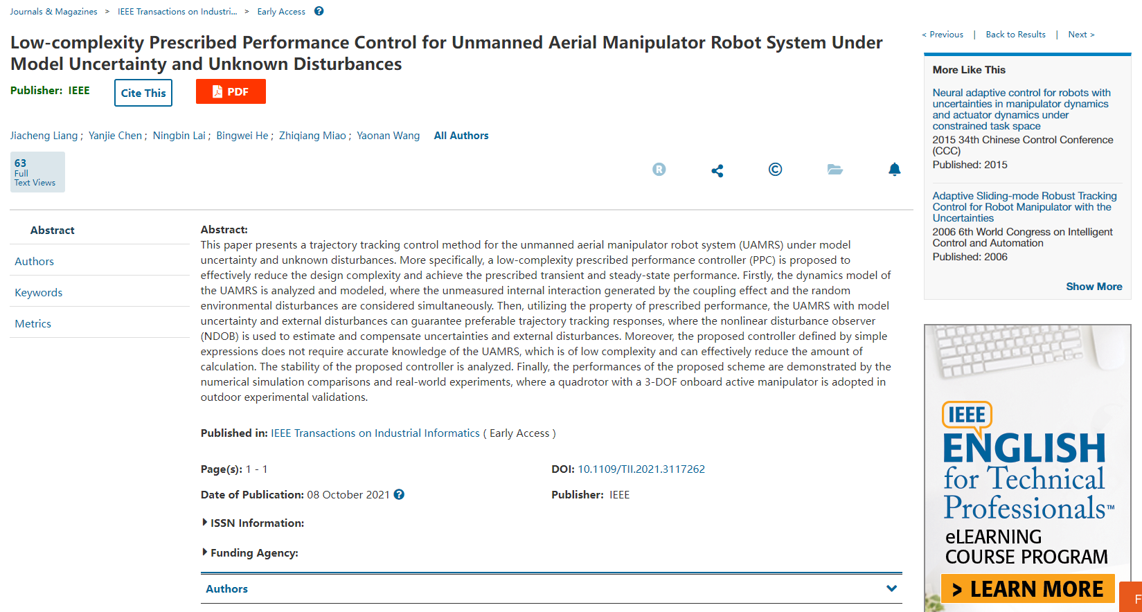 为第一署名单位发表研究成果“模型不确定和未知扰动下的无人飞行作业机器人低复杂度规定性能控制方法”。该论文由机械大象传媒