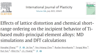 张祥凯老师在塑性领域国际顶级学术期刊《International Journal of Plasticity》(IF:8.5,中科院一区TOP期刊)线上发表了最新研究成果——“晶格畸变和化学短程有序对多主元合金的初始塑性变形行为影响:分子动力学模拟和第一性原理计算”《Effects of lattice distortion and chemical short-range ordering on the incipient behavior of Ti-based multi-principal element alloys: MD simulations and DFT calculations》。张祥凯为第一作者兼共同通讯作者,大象传媒