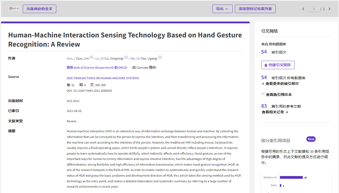 Human-Machine Interaction Sensing Technology Based on Hand Gesture Recognition: A Review论文旨在使读者能够系统、快速地了解手势识别的研究现状,揭示手势识别的基本问题和发展方向。文章以手势识别技术所采用的传感方法为切入点,通过总结近年来人机交互领域的研究成果,详细的阐述人机交互系统的研究现状,并展望未来人机交互领域的发展方向。目前,该论文在Web of Science上实时引用为54次。