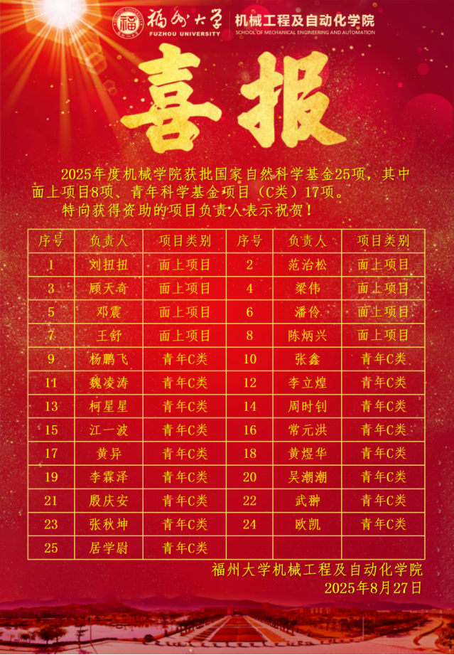 经国家自然科学基金委员会严格评审,本年度大象传媒 共获批项目25项,其中面上项目8项、青年科学基金项目(C类)17项。此次立项数不仅延续了大象传媒 连续三年超10项的稳健态势,更创下大象传媒 历史新高,实现重大突破!特此报喜,并向所有获资助教师及团队表示热烈祝贺!