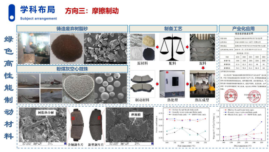 (3)摩擦制动领域。重点攻关高速重载、紧急制动等工况下刹车片的热衰退难题,研制出新一代绿色高性能无铜树脂基制动材料,该材料在300-350℃的高温摩擦系数不仅没有降低,反而升高,具有极为出色的抗热衰退性能,实现了其在高性能制动领域的应用。