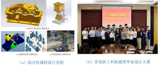 在课程设计实践方面,通过新增、合并调整等措施,形成涵盖材料、机械、机器人、车辆等基础与专业2个系列的6种综合课程设计,新编了3本课程设计指导书,全面提升解决复杂制造工程问题的能力。该环节的课程设计内容得到了企业的大力支持,目前已经有20余家单位提供了工程设计问题,使得课程设计变得趣味性强、有一定的技术挑战。另外,创造性的举办新工科机械类本科毕业设计大赛,以此激发本科生追求更高质量的毕业设计作品,首届新工科机械类本科毕业设计于2022届举办,具体如图8所示。