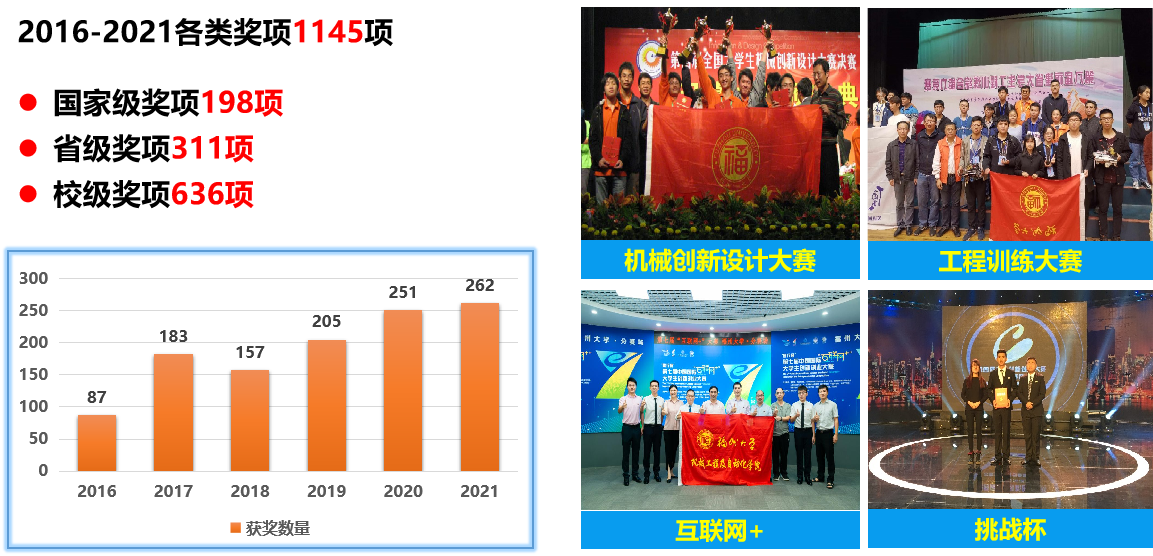 在高质量的培养平台、师资条件、实验科研条件、培养体系下,该专业人才培养成效显著、创新能力强。近五年来,本科生在机械创新设计大赛、工程训练大赛、互联网+、挑战杯等竞赛中,获得各类奖项1100余项,其中国家级奖项和省级奖项500多项。