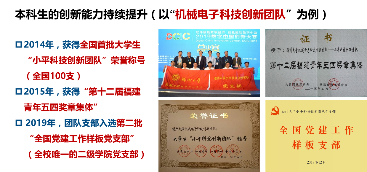 与此同时,本科生的创新能力获得持续提升。以“机械电子科技创新团队”为例,该团队凭借优异的表现,获得全国首批大学生“小平科技创新团队”称号、“福建青年五四奖章集体”和“全国党建工作样板党支部”等荣誉。