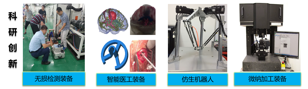 科研基础扎实、创新能力强。其中重要科研仪器设备价值近7000万元。形成了高端装备设计及理论、先进制造技术、机电测控与智能装备等优势科研方向。在无损检测装备、智能医工装备、仿生机器人、微纳加工装备等领域开展了科研创新实践。