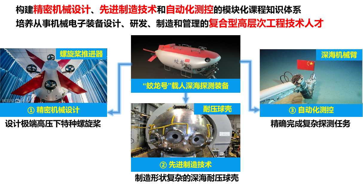 我们以“蛟龙号”载人深海探测装备为例,说明一下该专业课程知识在实际中的应用情况。“蛟龙号”是一个典型的复杂机械电子装备,它的研发过程中涉及到了精密机械设计、先进制造技术和自动化测控。在精密机械设计方面,“蛟龙号”安装了四个螺旋桨推进器,如何设计满足深海极端高压下的特种螺旋桨,这需要用到精密机械设计的知识。在先进制造技术方面,必须保证极端压力下“蛟龙号”内部人员的安全,加工出体积庞大、形状复杂的耐压球壳,这需要用先进制造技术的知识。在自动化测控方面,“蛟龙号”为了完成许多复杂的深海探测任务,安装有很多精密的探测与操作装置,如何精确地测试与控制这些装置、完成指定的复杂任务,这需要用到自动化测控的知识。