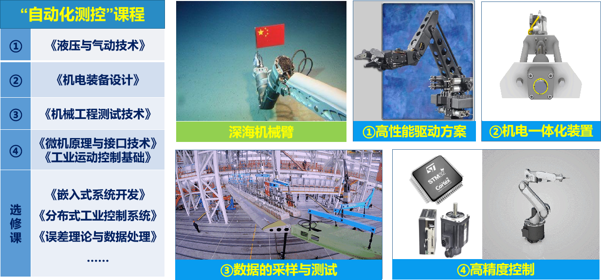 为了准确地完成深海下机械手动作的自动化测试与控制,需要:提出高性能的驱动方案、设计机电一体化装置、完成数据的采样与测试、实施高精度的控制。该专业分别设置有《液压与气动技术》、《机电装备设计》、《机械工程测试技术》、《微机原理与接口技术》、《工业运动控制基础》等课程,同时我们还加强了应用面广的“嵌入式系统”、“工业控制系统”等知识的学习,这些课程形成了系统的自动化测控知识体系,有助于全面提升自动化测控系统的设计能力。