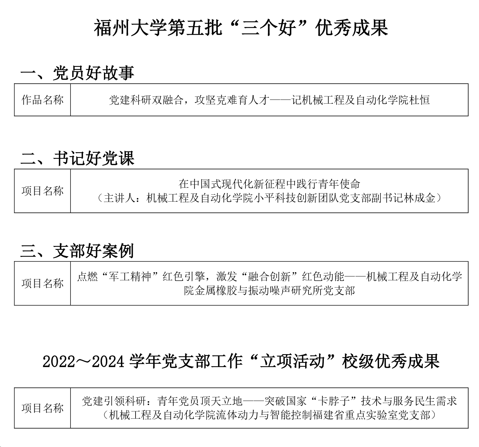 流体动力与智能控制福建省重点实验室党支部书记杜恒教授荣获“党员好故事”,小平科技创新团队党支部林成金副书记荣获“书记好党课”,金属橡胶与振动噪声研究所党支部荣获“支部好案例”;流体动力与智能控制福建省重点实验室党支部荣获“2022-2024学年党支部工作‘立项活动’”优秀成果。