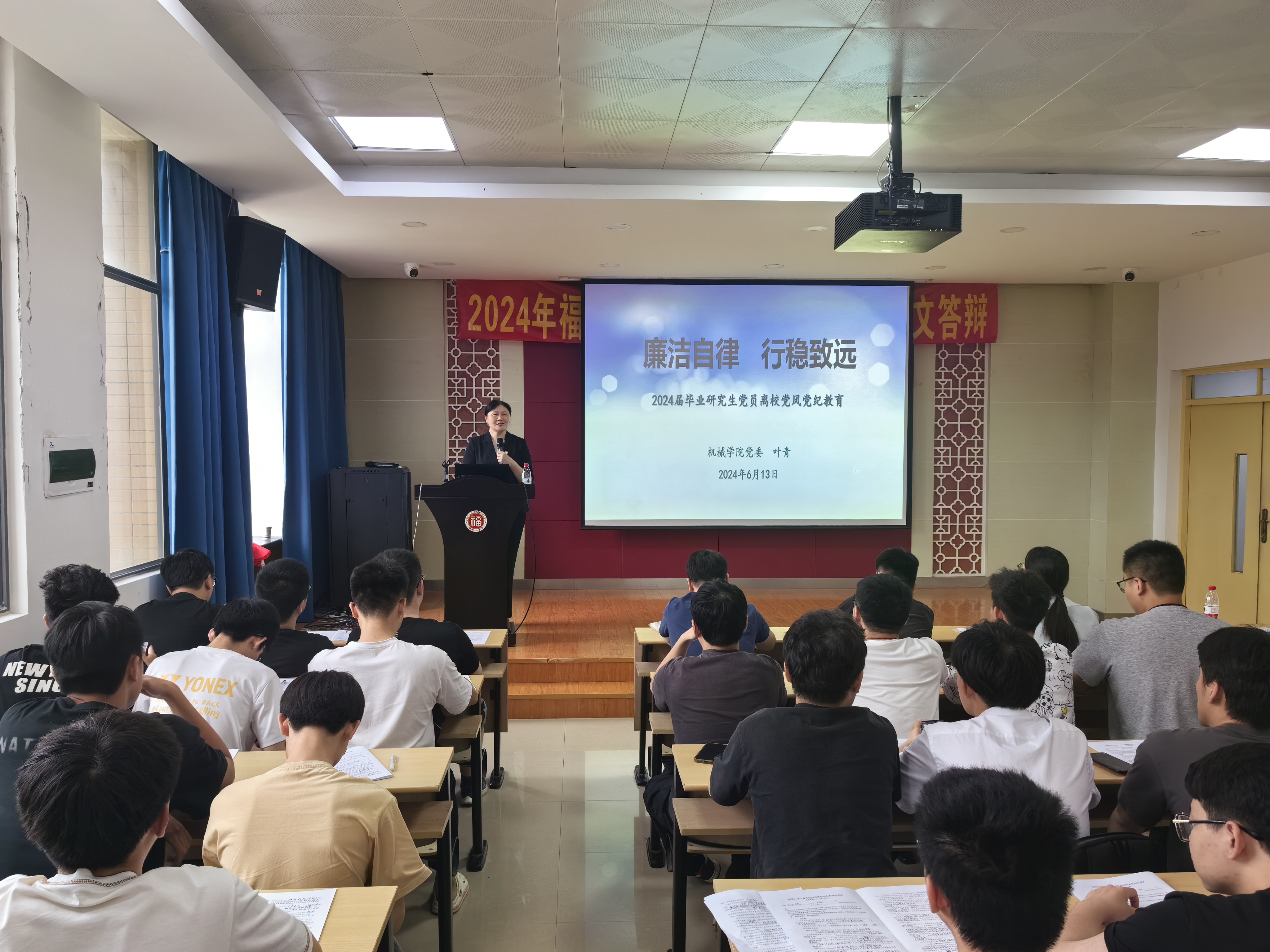 党委书记叶青以“廉洁自律 行稳致远”为主题,为2024届毕业生党员讲授离校前党风党纪教育专题党课,全体毕业生党员聆听此次党课。