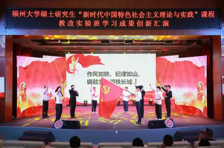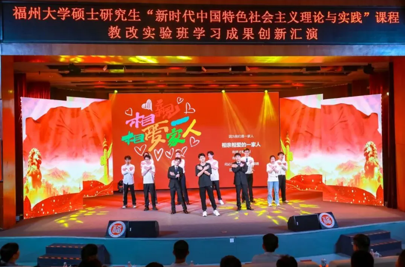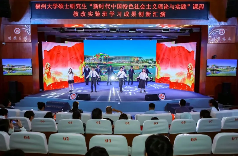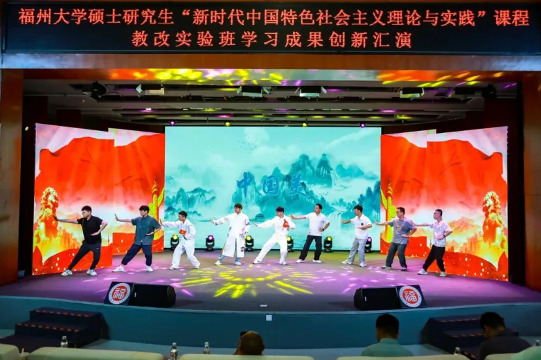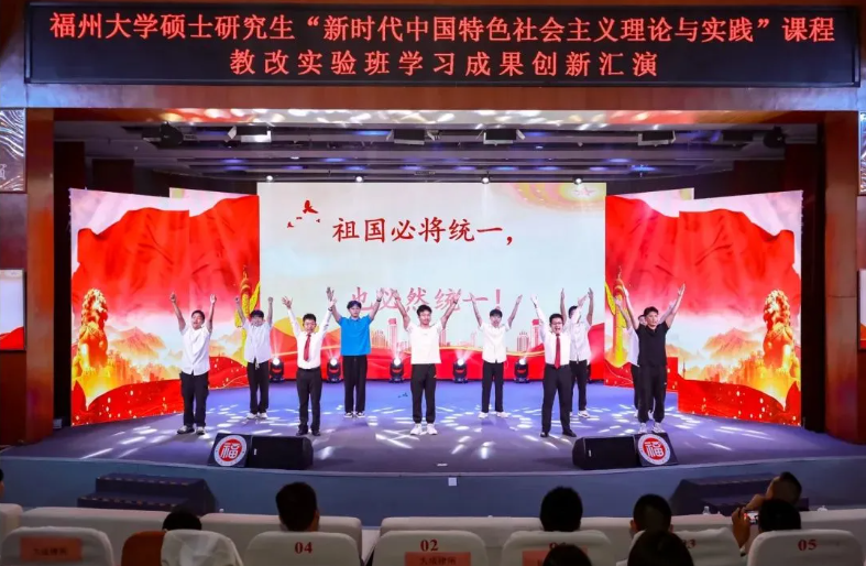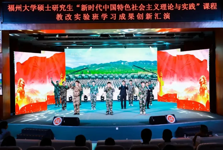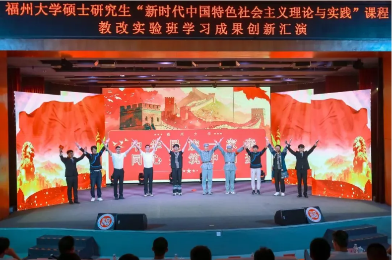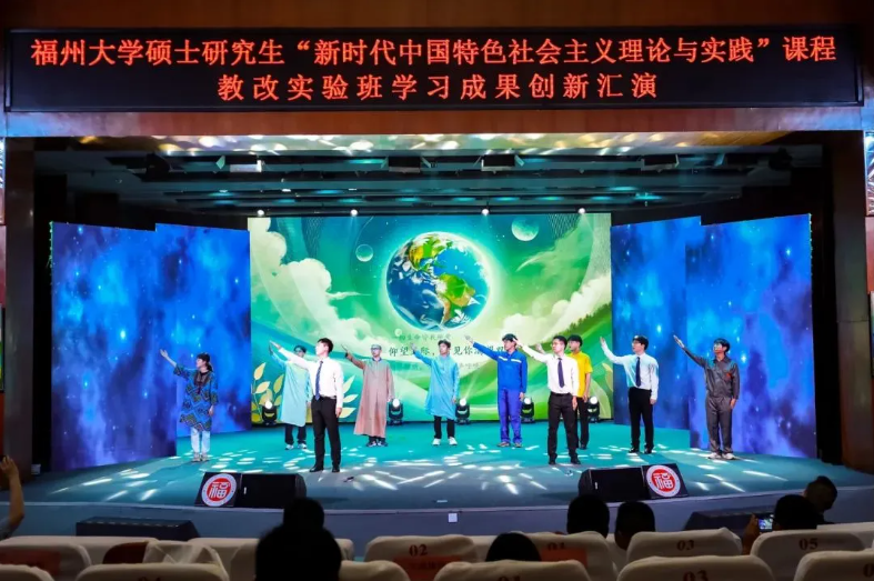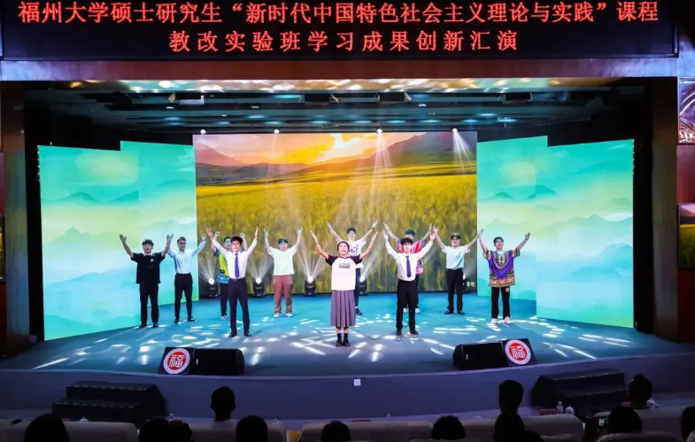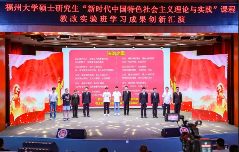 首创、十年来不断完善的“四融双动”教改法,呈现了这场汇演活动。“四融双动”教改法指的是,思政课日常教学中,在教师的指导下,要求学生以团队为单位,自主开展课题研究,并且自编、自导、自演,将“理论、实际、实践、艺术”四大元素有机融合,使学生受到“理性”和“感性”的双重触动。