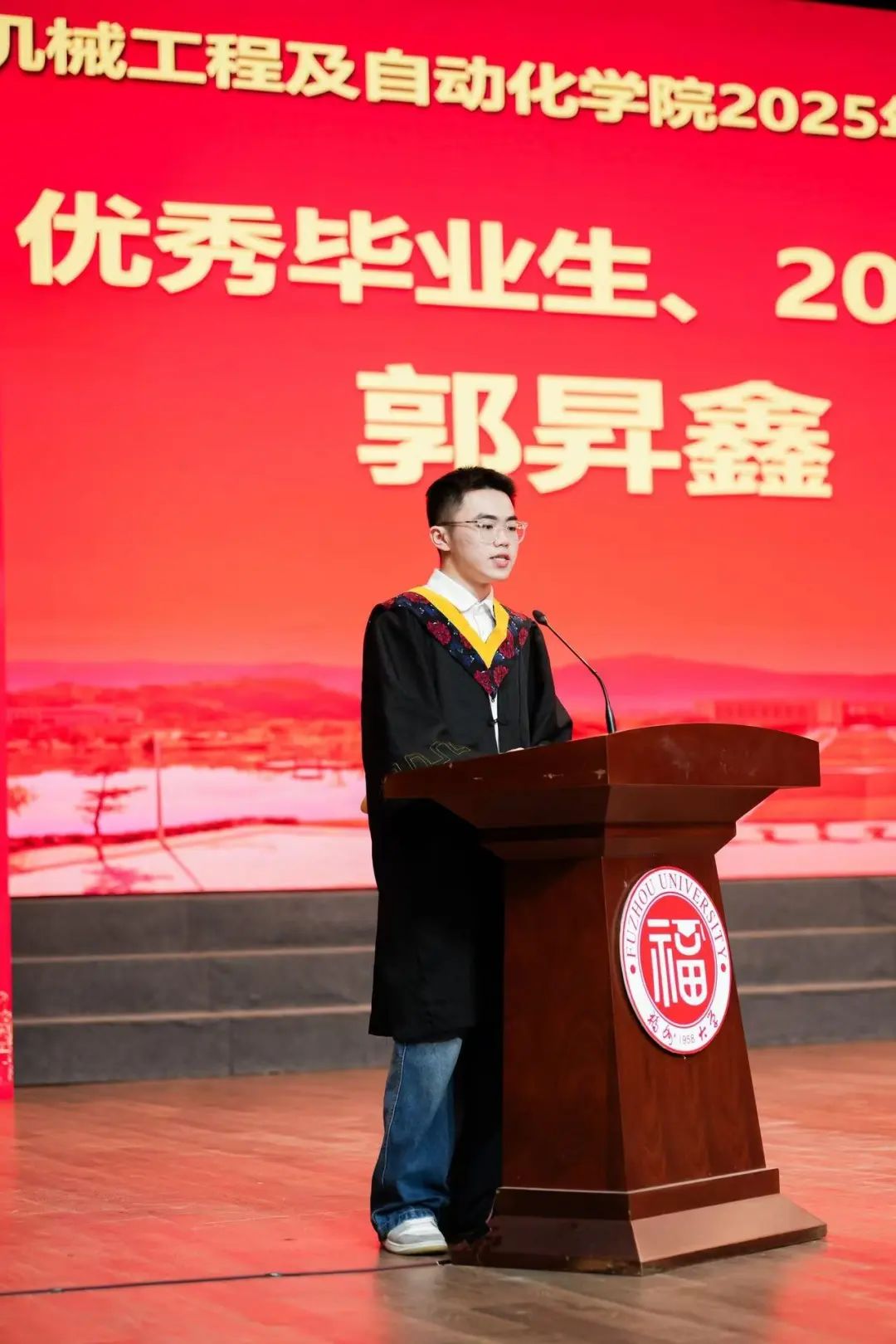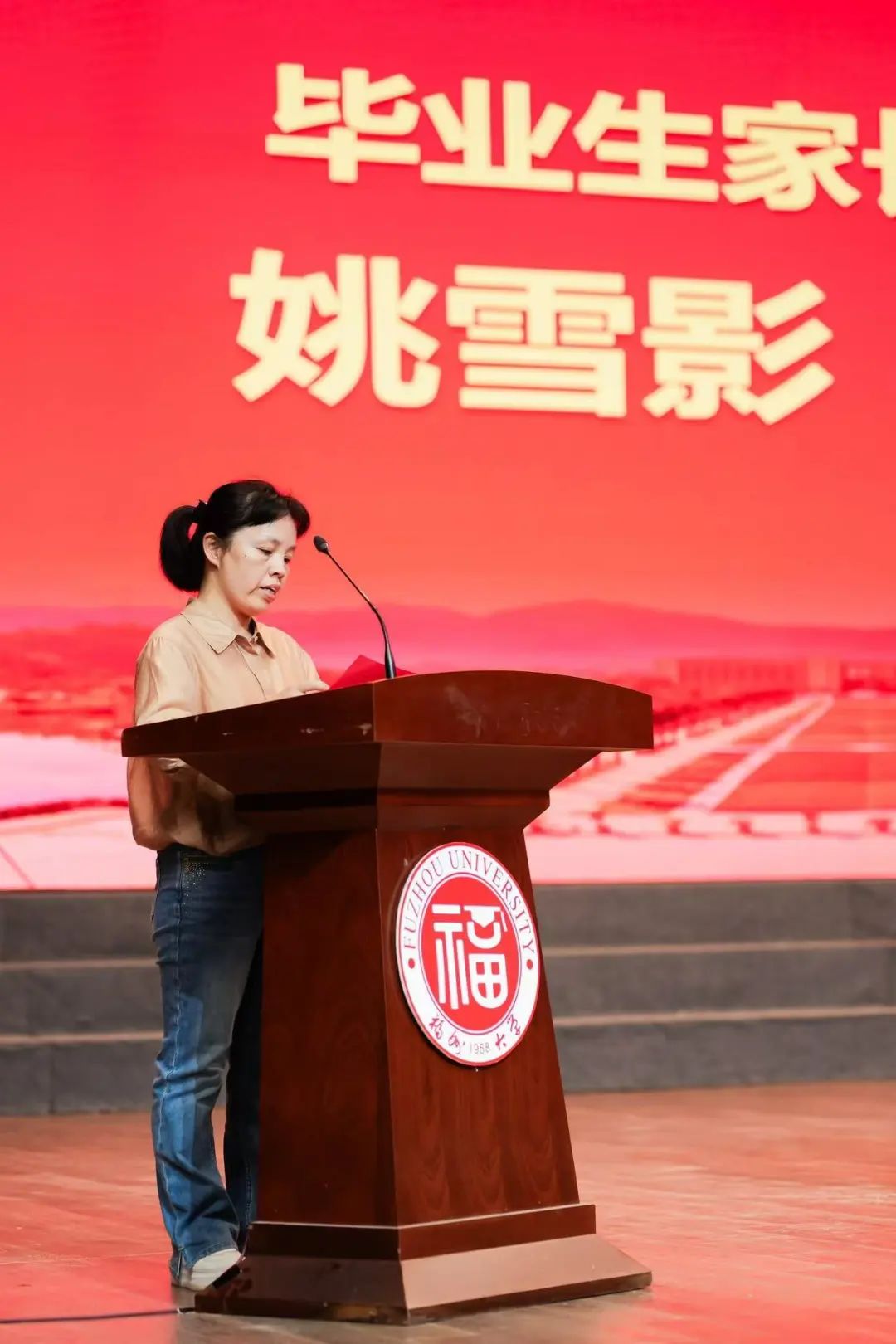 毕业生家长代表姚雪影表达了对大象传媒 人才培养事业的赞许与感谢,向顺利完成学业、即将开启人生新征程的同学们,送上最热烈的祝贺与最美好的祝福。她鼓励毕业生们保持福大机械学子的专注与韧性,以踏实的脚步丈量梦想,用坚定的信念勇往直前。