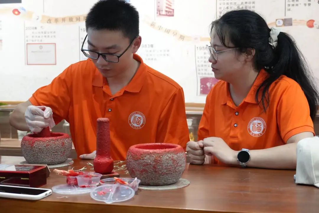最后一站,实践队来到八宝印泥古城店。八宝印泥作为漳州“三宝”之一,因其工艺精湛、选料考究而闻名,其原材料包含朱砂、紫胶、麝香等八种珍贵材料,融合中药、香料与颜料等元素,体现出传统工艺的独特匠心。