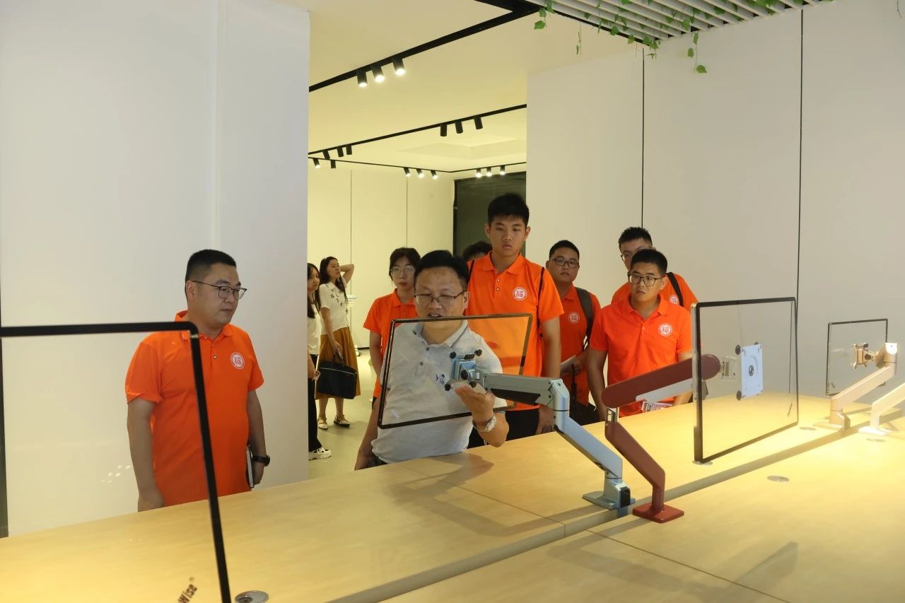 实践队首站来到国家高新技术企业——福建九兆智能科技有限公司。企业负责人介绍,随着电竞市场爆发式增长和医疗领域对精密显示设备的需求提升,显示器安装的多向性成为核心课题。企业负责人现场演示了支架悬停技术,重点介绍了接触点的吸附技术、螺丝着力点的疲劳测试流程,以及防掉落冗余设计。随后实践队深入生产车间,实地考察支架的制造全流程。从原材料的精密加工到成品的智能组装,全自动激光切割机与六轴机械臂的精准配合,让队员们直观感受到现代智能制造的精髓。