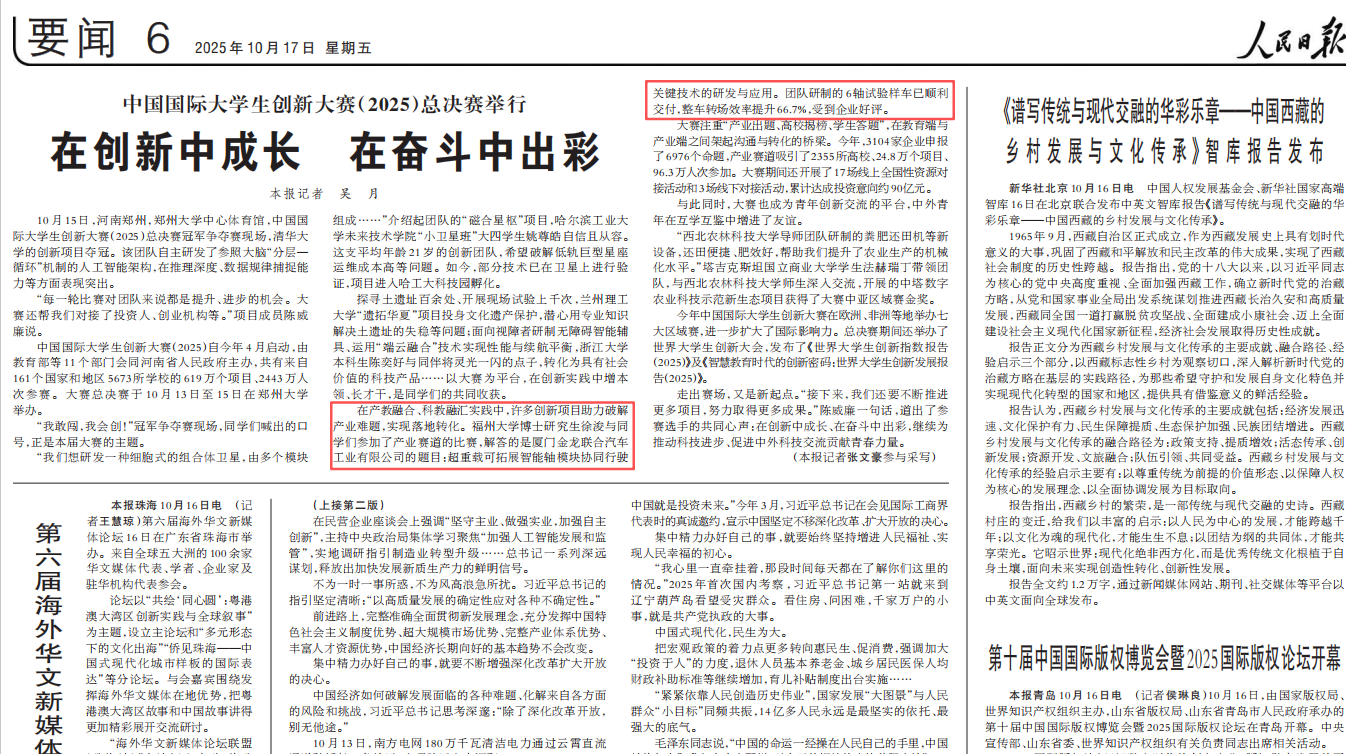 10月13日至15日,中国国际大学生创新大赛(2025)总决赛在郑州大学举行。大赛由教育部等11个部门会同河南省人民政府主办,郑州大学、郑州市人民政府承办。作为全国规格最高、规模最大、影响最广的青年学生创新活动,共有来自国内外161个国家和地区5673所学校的619万个项目、2443万人次报名参赛。