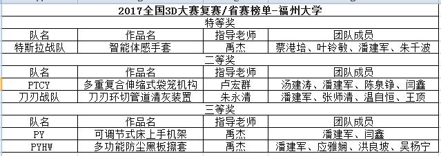 2017年10月,大象传媒 机械学子于2017全国3D大赛复赛/省赛中取得佳绩,硕果累累。其中“智能体感手套”作品获得特等奖,“多重复合伸缩式袋笼机构”作品与“刀刃环切管道清灰装置”作品获二等奖,“可调节式床上手机架”作品与“多功能防尘黑板擦套”作品获三等奖。