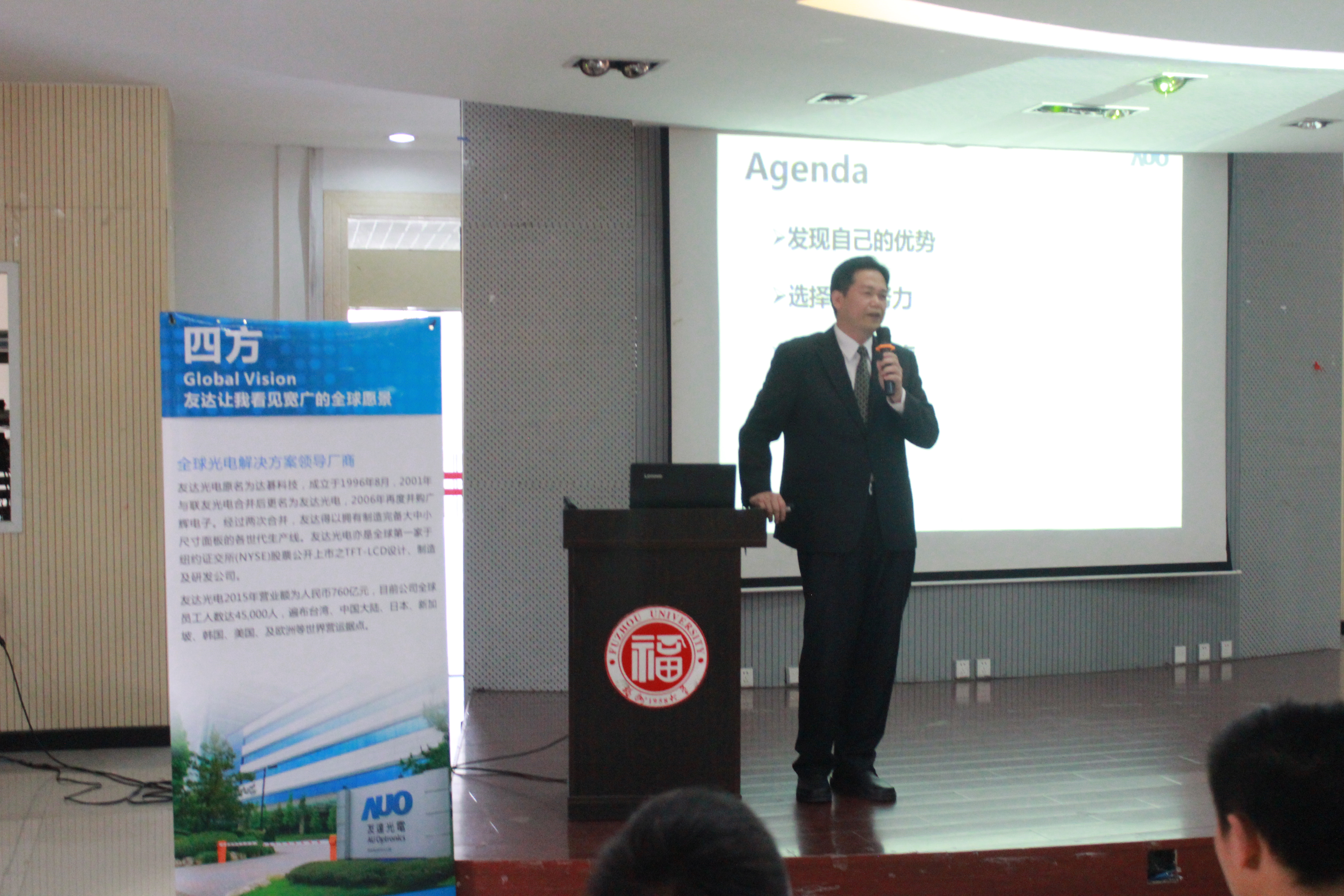 于素质拓展中心多功能厅开展“迎向职涯起点”就业指导专题讲座。本次讲座由友达光电(厦门)有限公司总经理符春坤主讲。