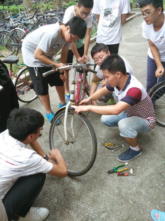 “旧车改造”实践队团队负责人邓清康简要交代近几日的实践内容,并对团队成员进行修车培训,从自行车的结构讲到自行车各部分的工作原理,又细讲了常见问题的甄别和维修方案。培训不止停留在理论层面,接下来,邓清康挑选了一辆废车,现场演示修车的步骤。队员们都认真地听讲。