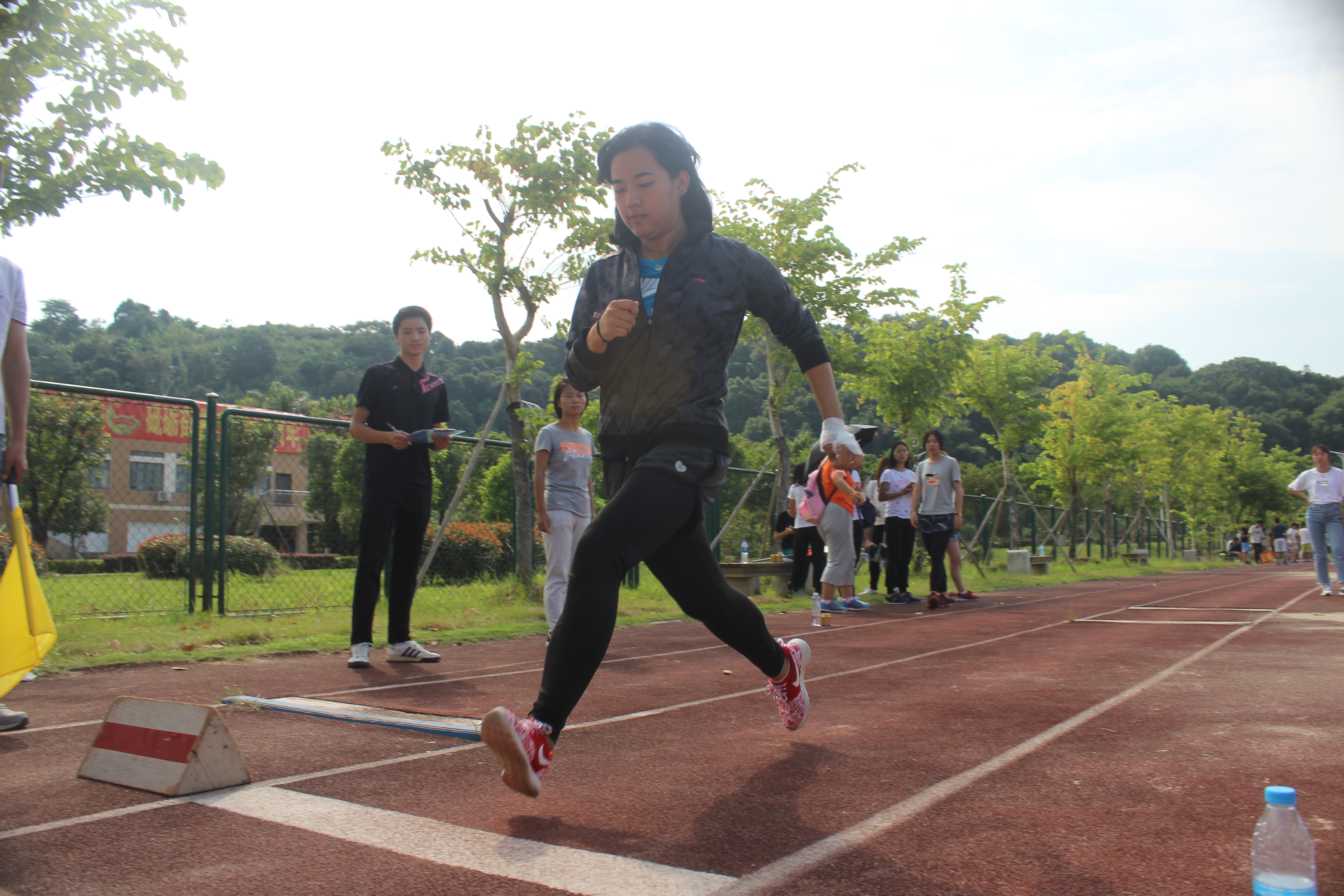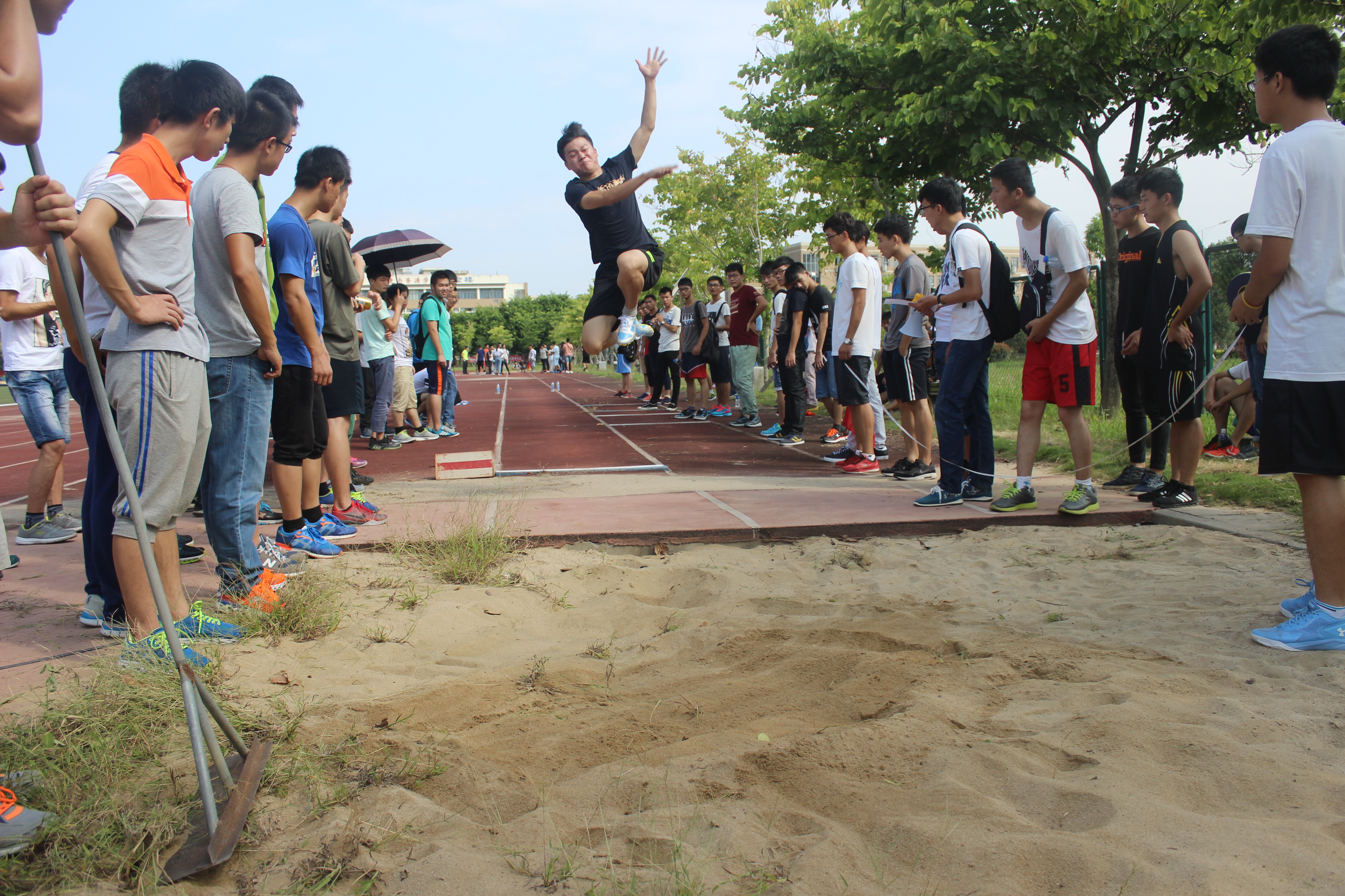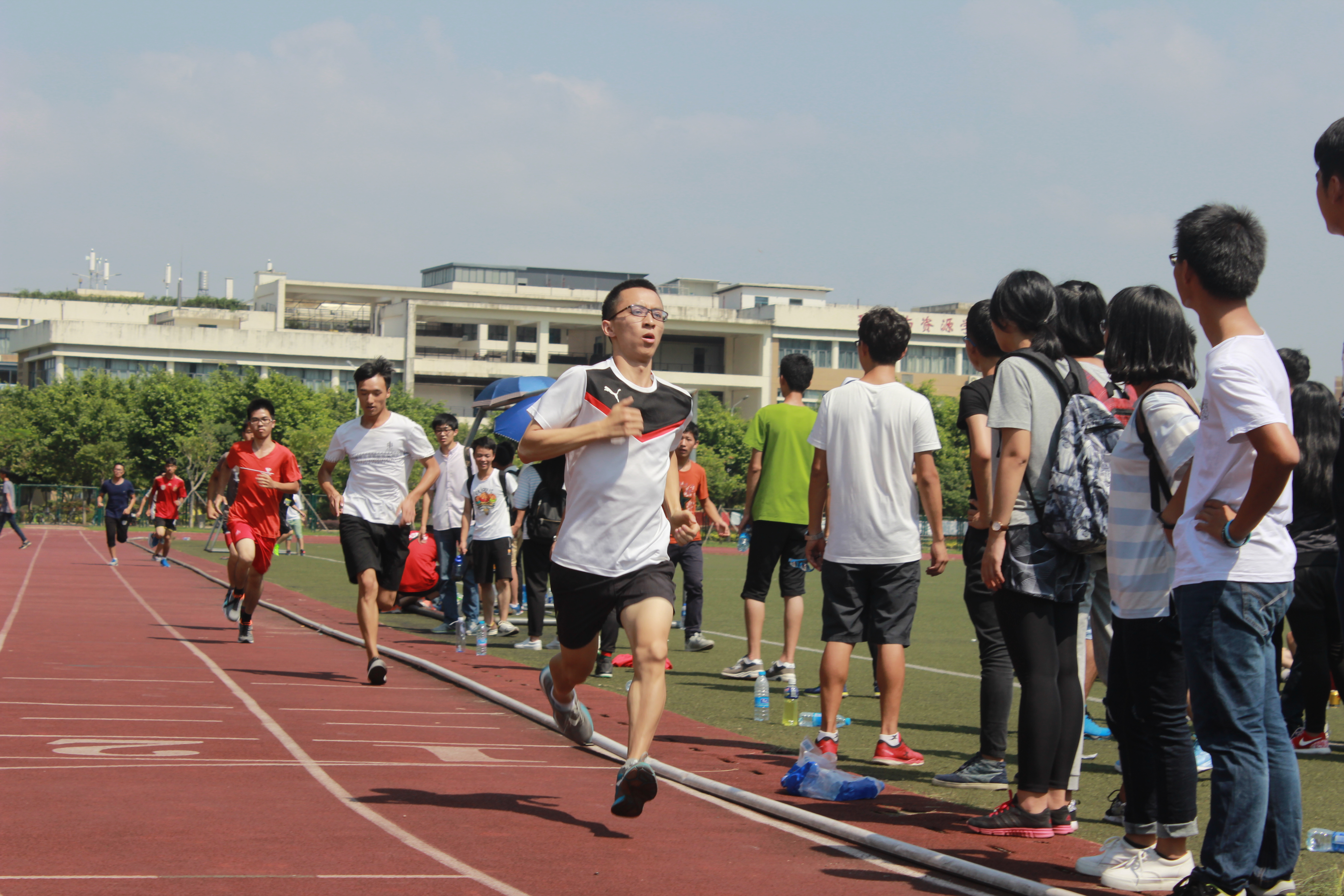 八点三十分未到,二十七名运动员到达现场热身。八点三十,男子一百米预赛拉开了整场运动会的序幕。该项目材控一班黄渠彪同学夺冠。紧跟其后,在女子100米项目中材控二班许冰冰同学以绝对的优势摘得桂冠。接着依次进行的是男女子400米、800米、1500米赛事,朱少杰、罗琦等选手分别获得第一名的好成绩。男子跳高比赛中,机制4班吴澄旭同学以1米55的好成绩赢得比赛,并且以5米27的成绩获得了跳远冠军,一个人获得两项项目冠军。许冰冰同学在跳高比赛中又荣获一等奖,被同学亲切的成为“运动女神”。在赛道旁,未参赛的同学为自己班级的选手加油鼓劲,更有三两个同学陪跑在一旁。