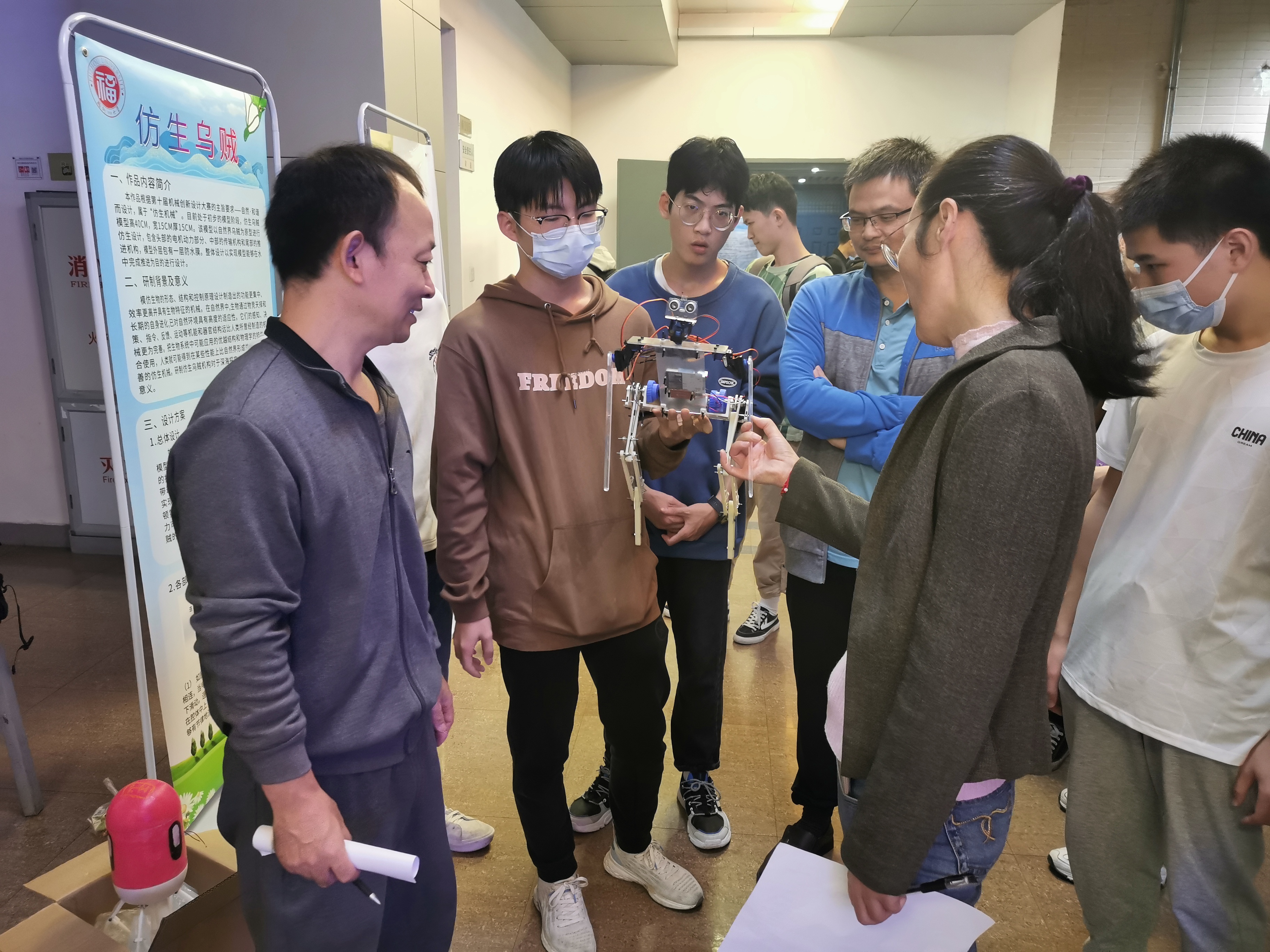 各组参赛队伍为本次校赛做了充分的准备。在比赛过程中,参赛选手们为评委老师详细介绍作品的设计理念、加工工艺和创新点,并且积极与其他队伍交流,探讨比赛的心路历程,相互汲取经验。评委们在听了选手的详细讲解和演示后,从创新性、结构设计、实用性等等方面进行公开评审,并为学生作品提出进一步的改进和提升建议。其中,管道检查仿生蛇、仿山羊四足机器人、仿生魟鱼等作品巧妙仿生,注重创新实践,突出实际用途,深受评委好评。最终,管道检查仿生蛇等五项作品荣获一等奖,仿生蝙蝠等16项作品获得二等奖,用于火场救援的仿生象形机械等9项作品获得三等奖。