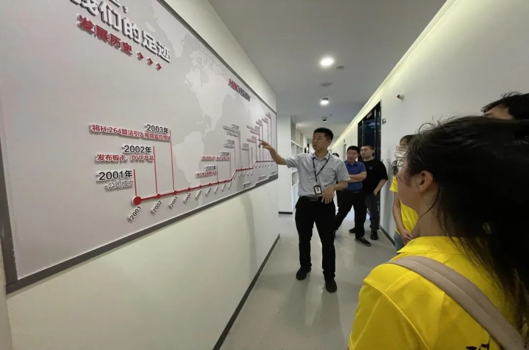 实践队一行人在张晋铭学长的带领下参观了海康威视科技展厅。学长从发展历史、公司荣誉、业务范围等方面介绍了海康威视的整体情况,向实践队成员们展示了公司研发的主要产品。