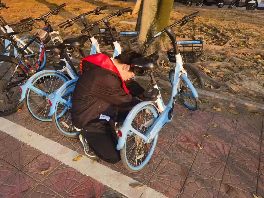青年志愿者发挥专业优势,开展“安全护航——共享单车维修和秩序维护”志愿活动。对生活区、教学区共享单车停车点的单车进行安全排查、维修以及有序停放工作,保障了共享单车的出行安全,并呼吁同学们自觉遵守社会公德,共同维护共享单车停放秩序,关注生活环境的整洁和便利,营造“人人共建、人人共享”良好氛围。