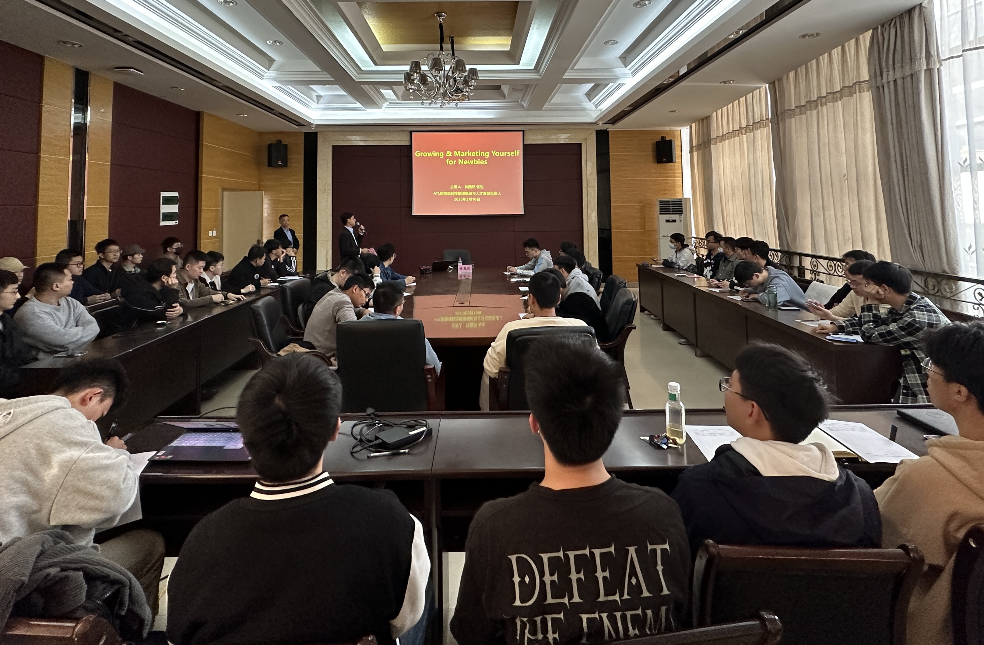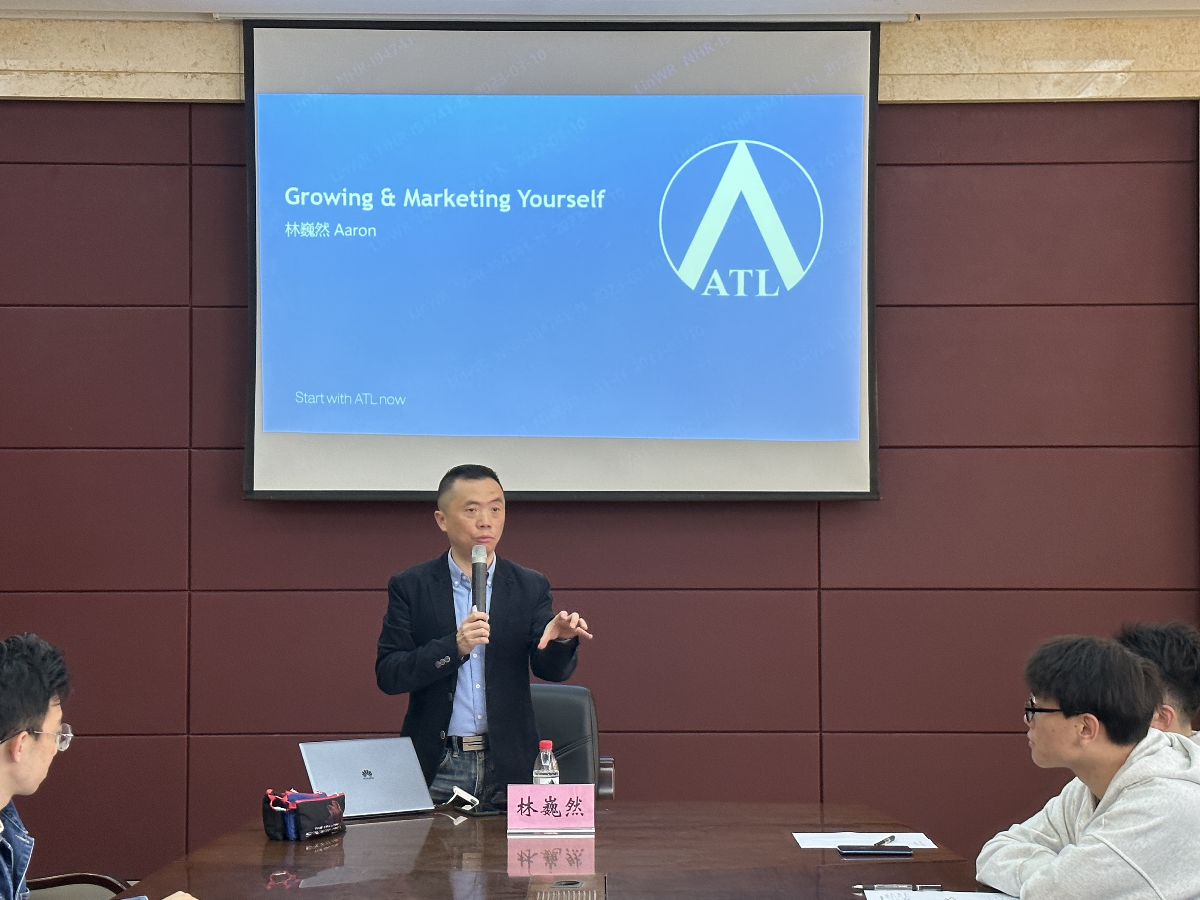 “职在必得”就业指导系列讲座在南楼401会议室开讲。ATL新能源科技集团组织与人才发展负责人林巍然先生作了题为“Growing & Marketing Yourself - for Newbies”的专题讲座。讲座由大象传媒