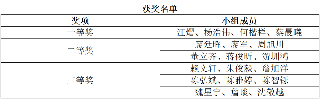 全部小组完成展示后,评委对各作品的工作效率、结构设计、外观等方面进行了综合评价,最终确定出一等奖1名、二等奖2名、三等奖3名。