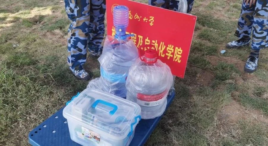 的后勤推车上放置着防暑药品和桶装水,辅导员与医务室的工作人员时刻准备着应对突发状况。