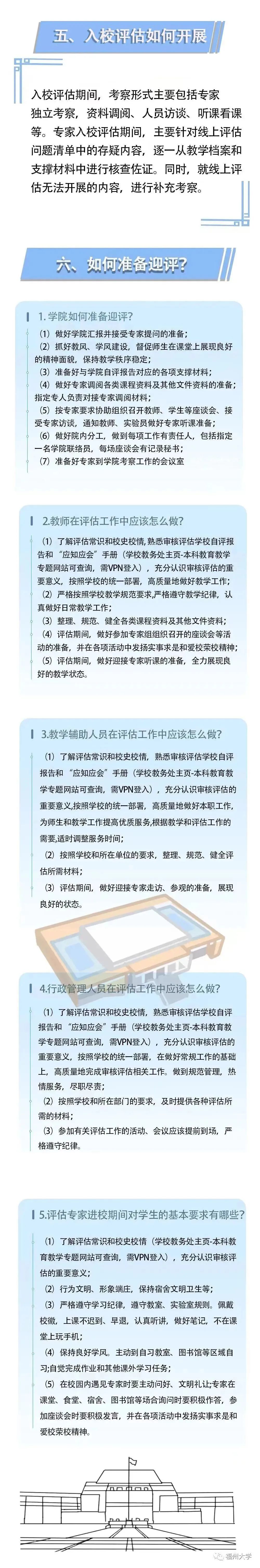 进行第二阶段的入校评估。专家入校评估主要针对线上评估问题清单中的存疑内容,以访谈座谈、调阅资料、听课等方式进行核查佐证。同时,就线上评估无法开展的内容,进行补充考察。作为一名福大人,我们应该熟悉了解哪些内容,做好哪些准备呢,一起来看一下吧。