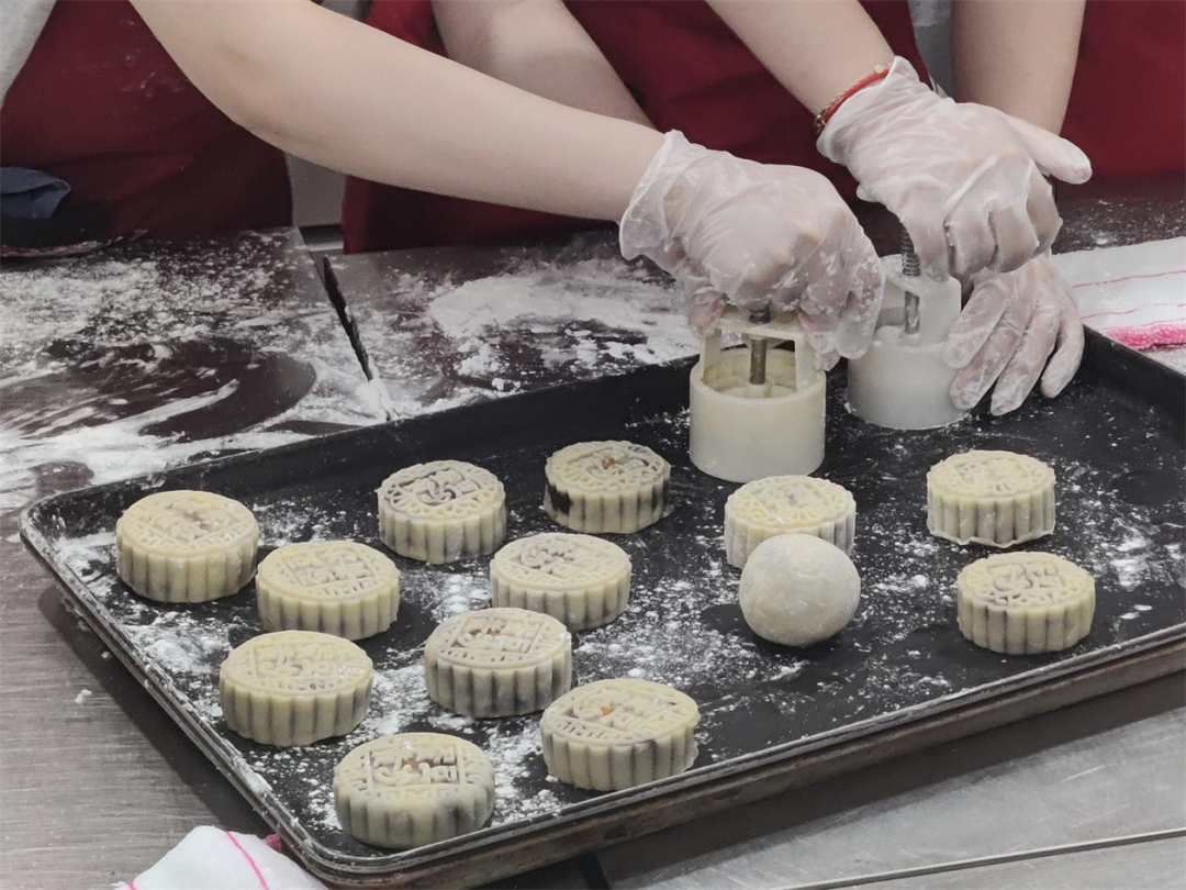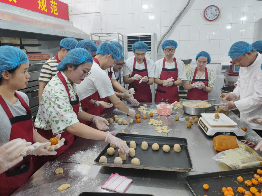 与校后勤管理处联合举办的“庆国庆·迎中秋·劳动美——广式月饼制作”主题活动。工作人员带领师生们进行了月饼烘焙的学习。
