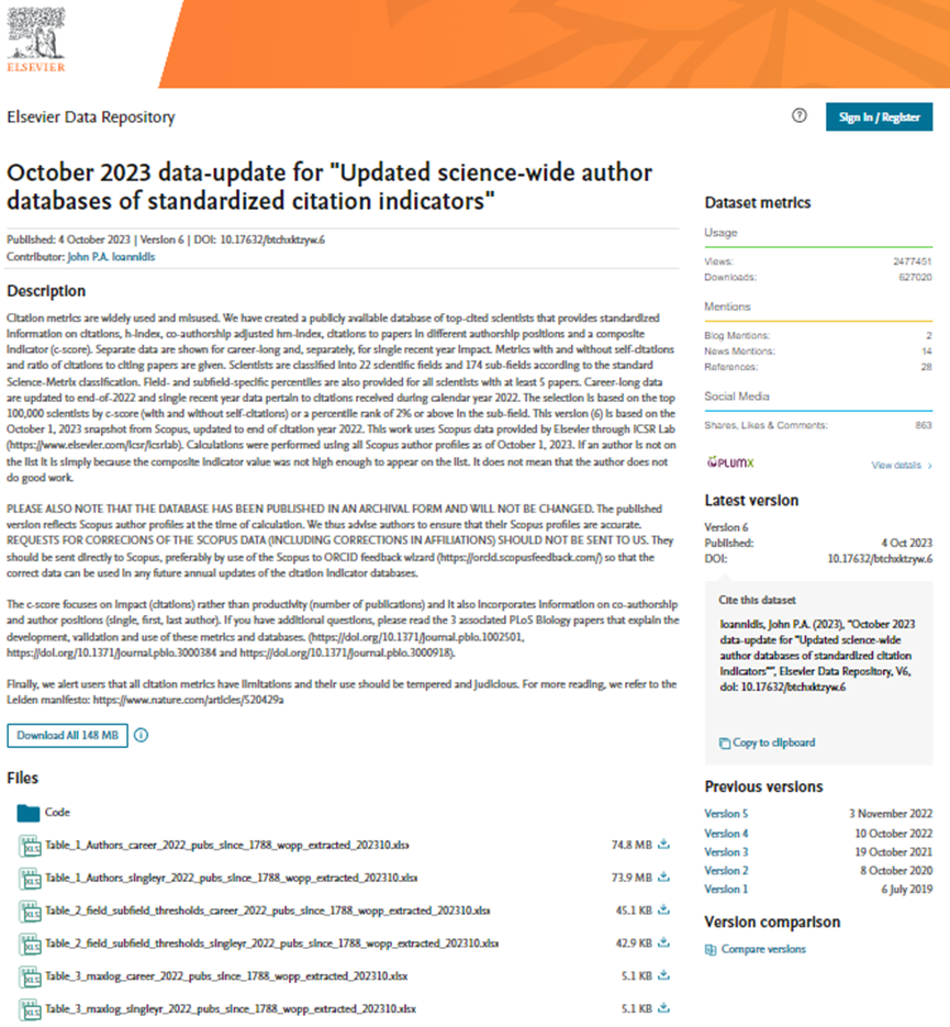 榜单来源:Ioannidis, John P.A. (2023), “October 2023 data-update for "Updated science-wide author databases of standardized citation indicators"”, Elsevier Data Repository, V6, DOI: 10.17632/btchxktzyw.6