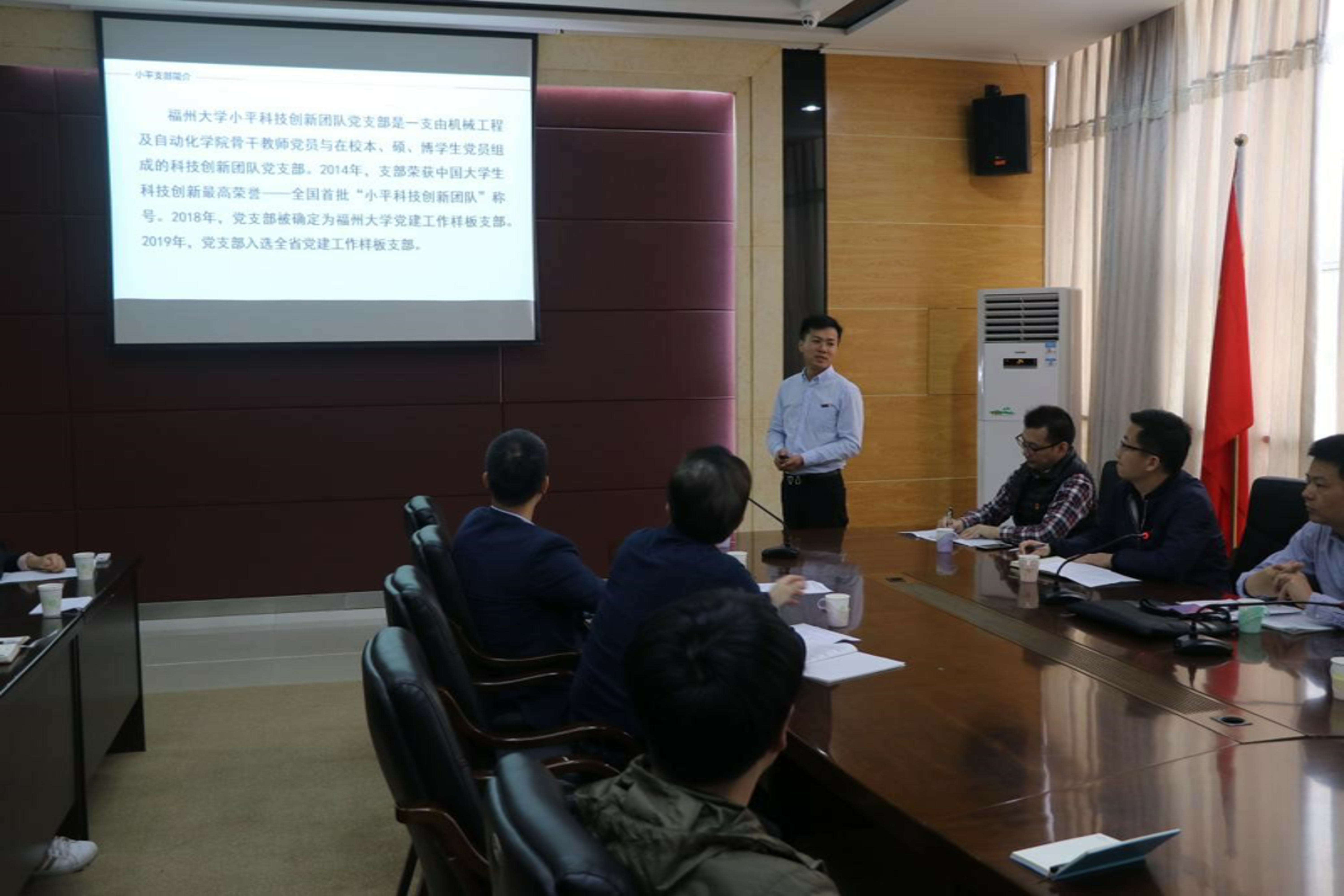 随后,小平科技创新团队党支部林成金书记对整个小平支部进行了介绍,包括小平支部的人员组成,创新团队所获奖项和做出的研究成果等,最后对支部的工作计划进行了汇报。