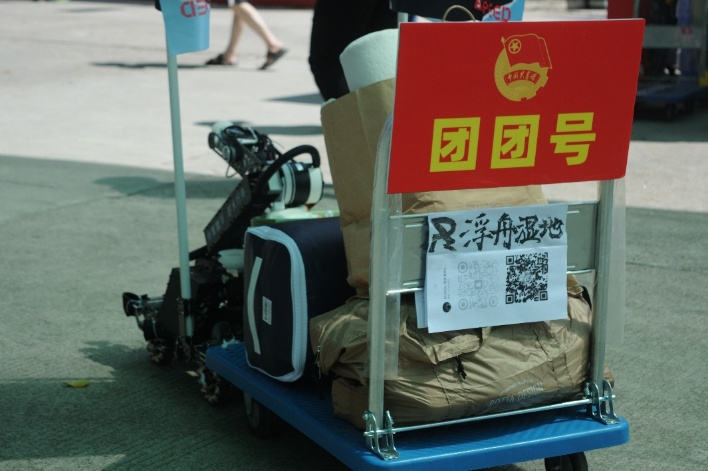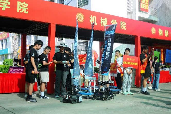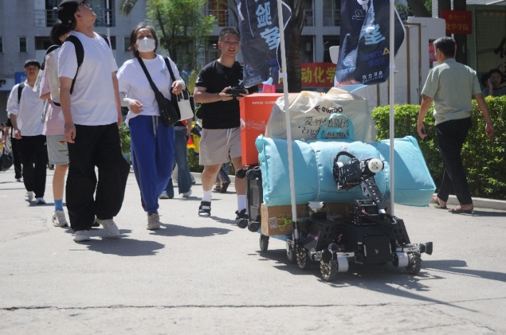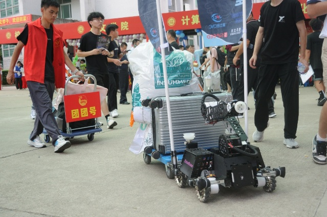 铛的一声,由浮舟湿地竞技机器人战队设计的机器人搬运车闪亮登场,其酷炫且充满科技感的外观和高效敏捷的灵活性,吸引新生们驻足观望。机器人搬运车穿梭在校园各个角落,既助力新生迎新报到,更充分展露出福大机械学子良好的工程实践能力和创新力,也为新生们在心里埋下一颗创新的种子。