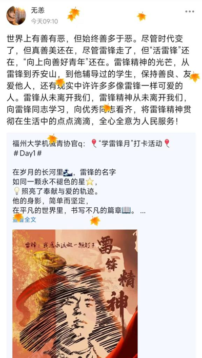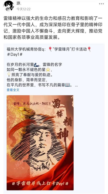 开展7日雷锋知识学习打卡活动,学生积极参与并分享学习感悟。活动丰富了大家对雷锋精神内涵的了解,激励了机械学子积极学习“钉子精神”,争做向上向善好青年。