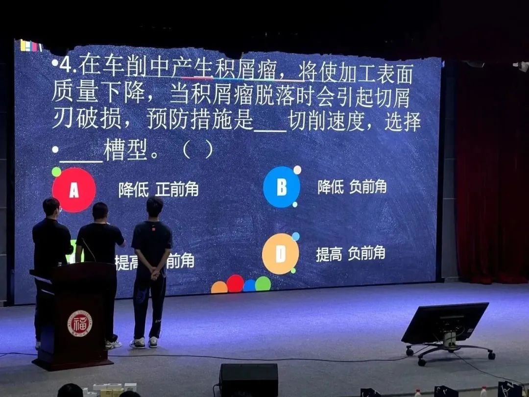 经过初赛激烈的角逐,6支优秀的队伍从中脱颖而出、向冠军发起冲刺。六支队伍依次上台进行团队展示,幽默诙谐的自我介绍赢得观众的阵阵掌声。比赛环节正式开始,进行了“必由之鹭”“小李飞刀”“励志竭金”三个环节,参赛选手们快速的反应能力与丰富的金工刀具知识储备赢得了现场观众的连连赞叹。此次竞赛集竞技性和趣味性于一体,各轮比赛结束后的互动问答、游戏和抽奖环节,让现场观众参与感满满,不断将会场气氛推向高潮。