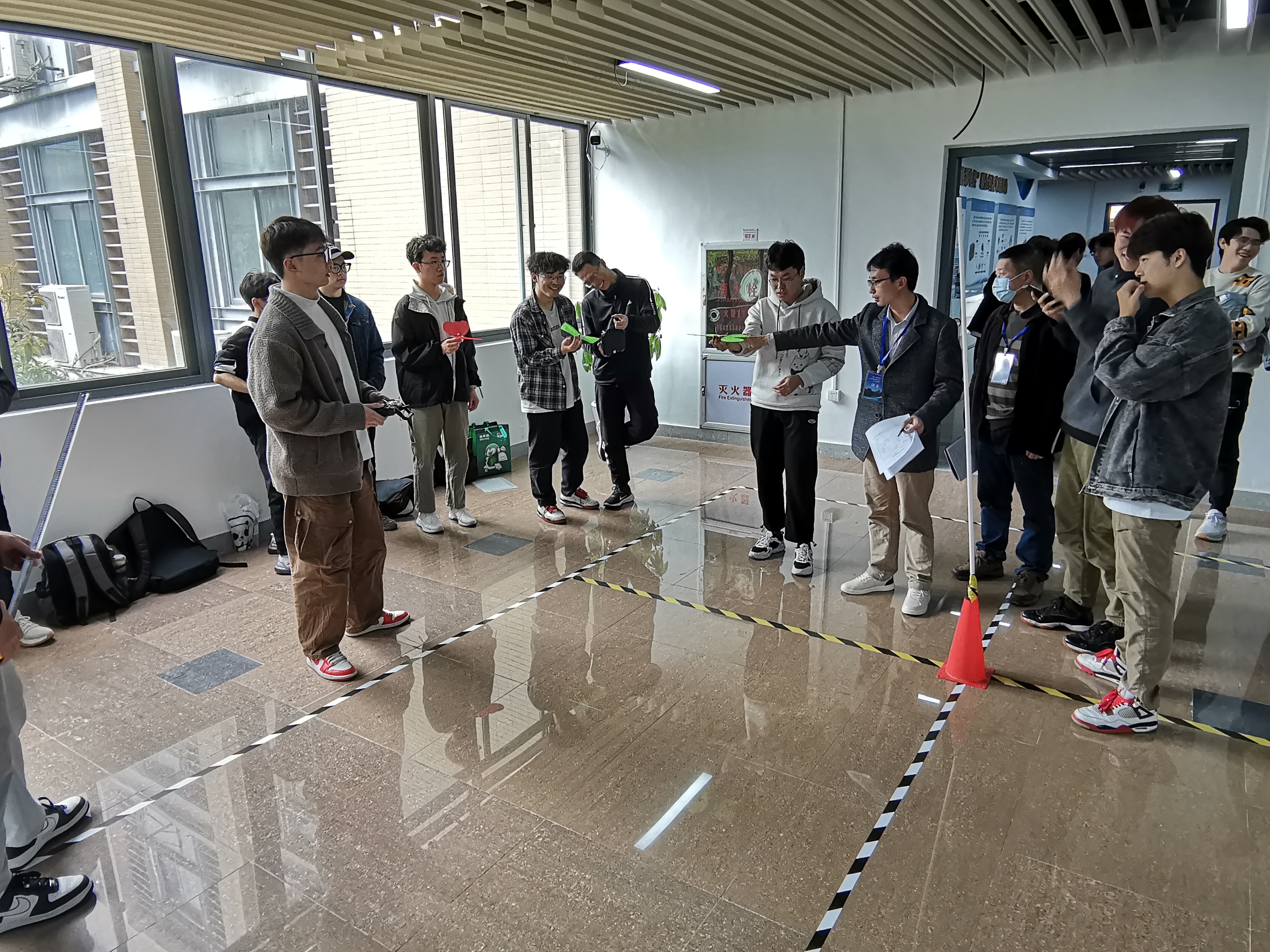 仿生赛道比赛在大象传媒 二楼走廊举办,仿生赛道包含仿生青蛙以及仿生蝴蝶项目,各有4组队伍参赛。赛前,老师先对选手做出的产品进行称重,度量尺寸,确保产品符合比赛要求。